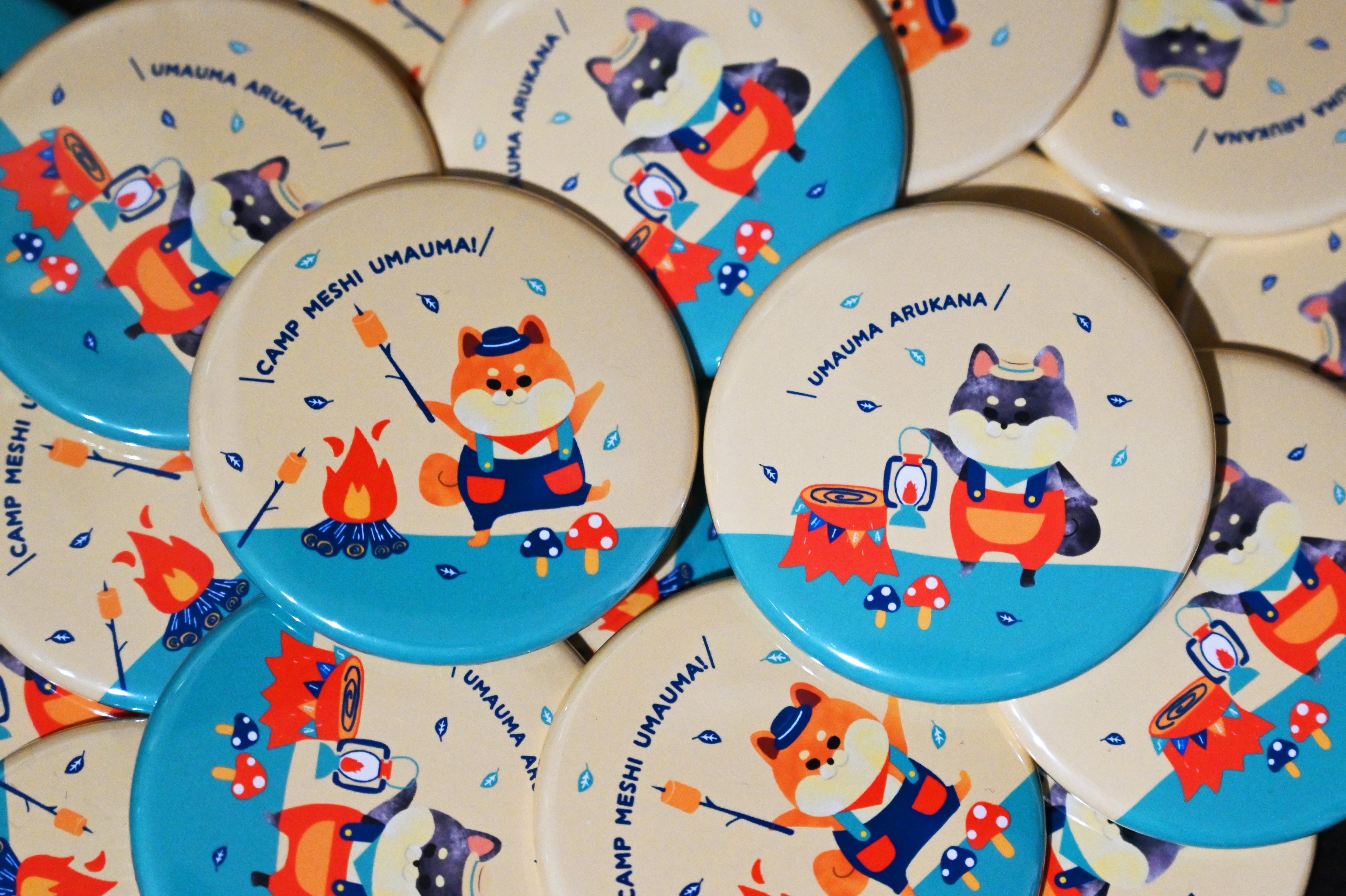 柴犬さんがキャンプをしているアウトドアイラストの缶バッジが登場!
